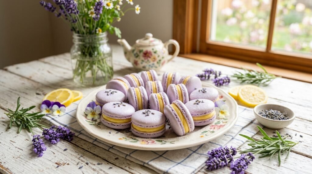 Macarons boast a smooth, domed top and distinct ruffled “feet.” For this spring variation, you can tint the shells a soft lilac purple or a sunny lemon yellow. You might even split the batch and do half of each color. A tiny sprinkle of dried culinary lavender buds on top of the shells before baking adds a beautiful, rustic texture.