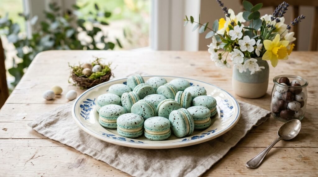 Taking inspiration from nature, speckled robin’s egg macarons make a whimsical addition to any spring celebration. These treats capture the iconic blue-green color of wild bird eggs, complete with delicate brown speckles.